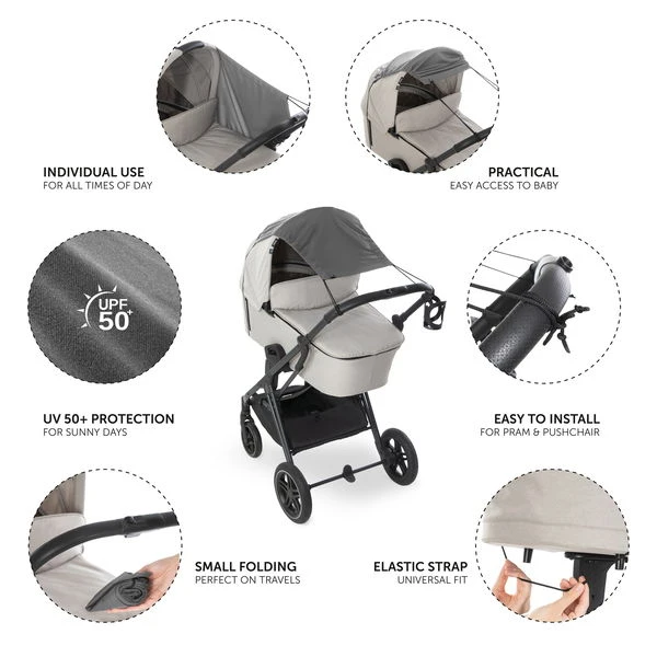 Das Sonnendach ist mit UV-Schutz 50+ versehen und wird mittels eines Gummizugs sowie mit zwei Bändern am Kinderwagen befestigt. Es lässt sich je nach Bedarf weit nach vorne ziehen oder nach hinten schieben, wodurch du deinem Kind problemlos Zugang verschaffen kannst.